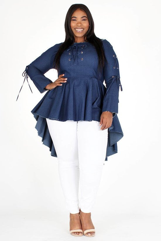 TRUE TO SIZE, MODEL WEARING 1X 100% Cotton  Denim, peplum, tunic top in a fitted style with a round neckline, lace-up strings, long sleeves, pleated details, hi-low hem, and back...
