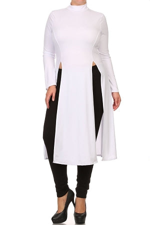 TRUE TO SIZE MODEL WEARING 1X 95% Polyester 5% Spandex   This white double slits long sleeve tunic with a mock neck.